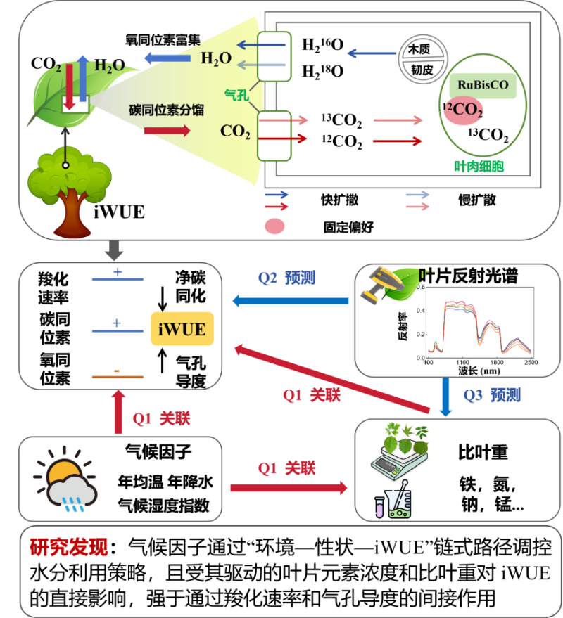 针对上述问题,严正兵研究员等依托中国科学院林冠塔吊平台,系统采集我国三大典型森林生态系统的林冠叶片样本,进行了iWUE 与多重叶性状、叶反射光谱的关联研究。结果表明,最大羧化速率,气孔导度,铁、氮、钠、锰浓度以及比叶重是驱动iWUE变异的关键性状。同时,气候因子通过 “环境–性状–iWUE” 链式路径调控水分利用策略,且受其驱动的叶片元素浓度和比叶重对 iWUE 的直接影响,强于通过羧化速率和气孔导度的间接作用。其次,叶片反射光谱技术在表征 iWUE 变异及性状与 iWUE 的关联方面,展现出较高的准确性。本研究不仅填补了“元素功能–水分利用策略”关联空白,还为生态模型提供关键参数,提升了森林碳–水循环模拟精度。反射光谱技术的应用,也为未来通过遥感实现大范围、高时效监测奠定基础,对预测气候变化下森林功能动态、制定科学管理策略具有重要意义。