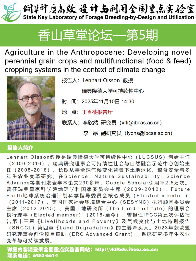 2025年11月10日“香山草堂论坛”第5期:Agriculture in the Anthropocene: Developing novel perennial grain crops and multifunctional (food & feed) cropping systems in the context of climate change