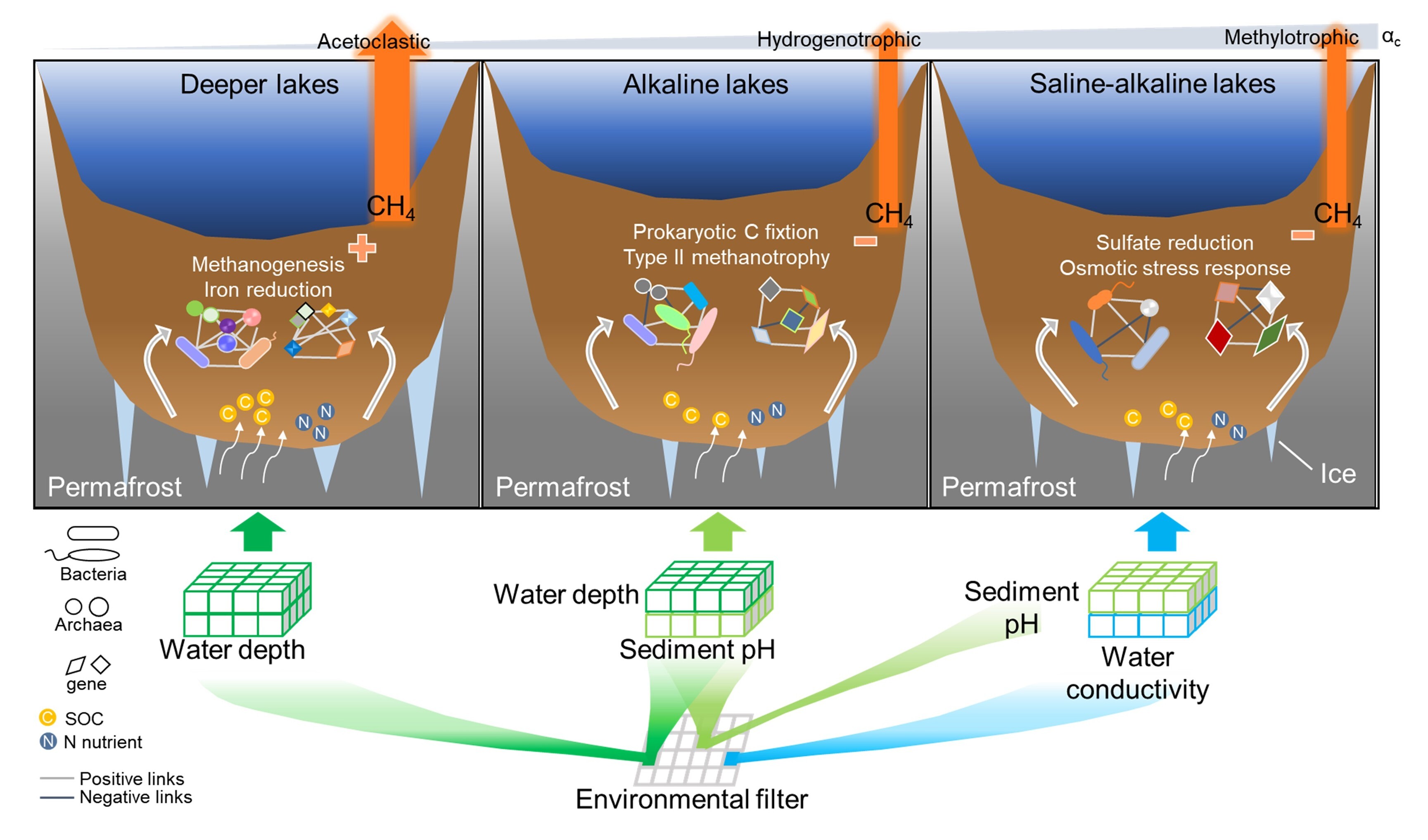 针对上述问题,杨元合研究团队以青藏高原多年冻土区广泛分布的热融湖塘为研究对象,基于大尺度野外调查、室内培养实验、稳定同位素技术、扩增子与宏基因组测序等手段阐明了热融湖塘沉积物微生物群落结构与功能特征及其与CH4产生的关联机制。研究人员发现,热融湖塘深度与盐碱度是影响沉积物微生物结构和功能的关键因素。在较深的湖塘中,以乙酸代谢途径为主的产CH4菌丰度更高,且与CH4产生相关功能基因显著富集,进而使其具有较高的CH4产生量。相反,在受高pH胁迫的浅湖中,II型CH4氧化菌消耗以氢代谢产CH4途径为主要来源的CH4,导致其CH4产生量降低近10倍。此外,在受盐碱度共同胁迫的湖塘中,硫酸盐还原菌及其编码的异化硫酸盐还原基因显著富集,其会通过与乙酸和氢代谢途径产CH4菌竞争底物,进而抑制净CH4生成,同时使得甲基代谢产CH4途径占据优势。进一步研究发现,沉积物有机质碳氮供给、关键微生物类群与功能共同导致热融湖塘CH4产生量的空间变异。其中,关键类群与功能在共表达网络中的连接度越高,其对CH4产生量的预测能力越强,表明微生物之间的交互作用在调节热融湖塘CH4产生过程中起着关键作用。上述发现促进了学术界对热融湖塘沉积物CH4产生机制的认识。